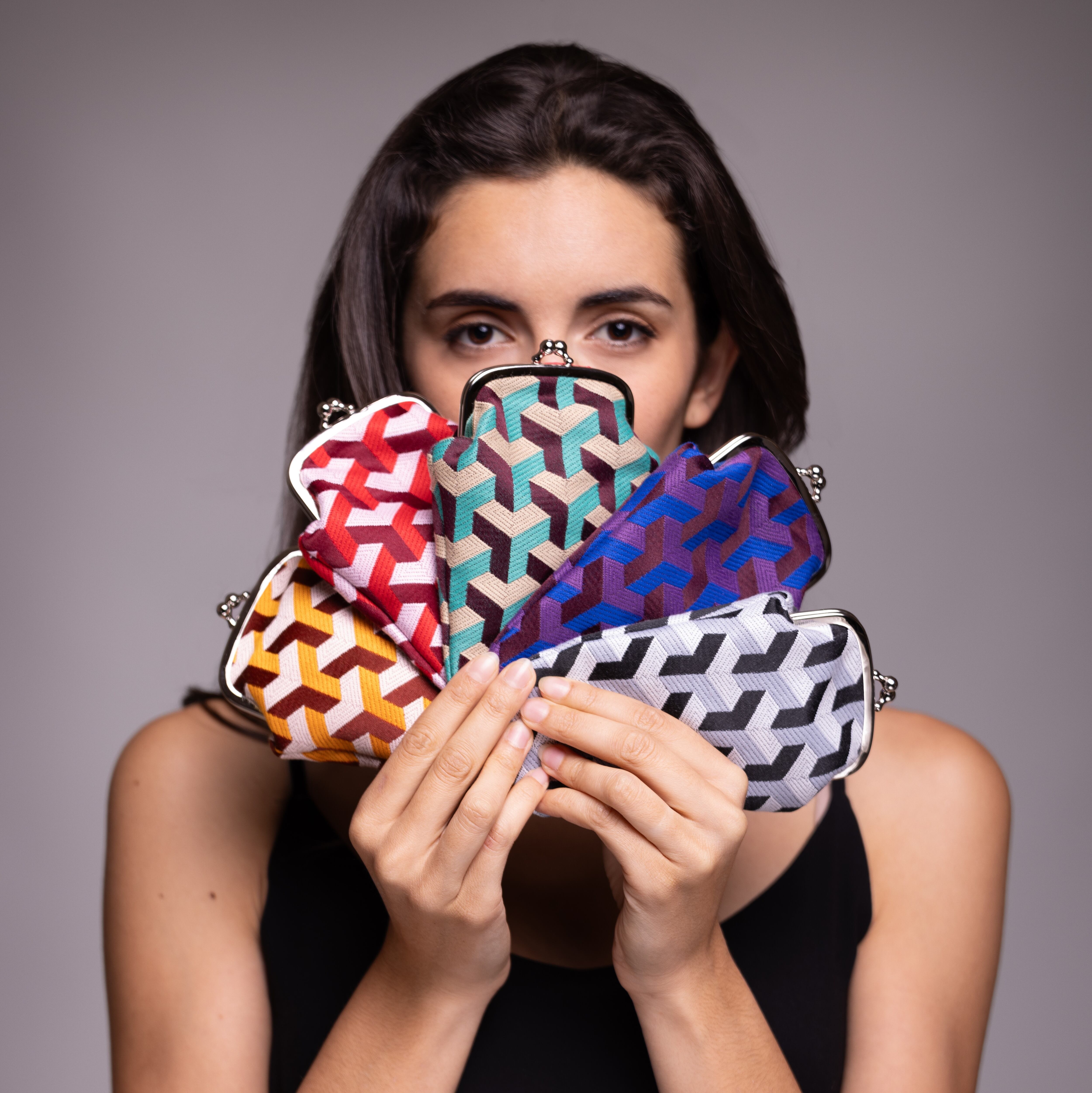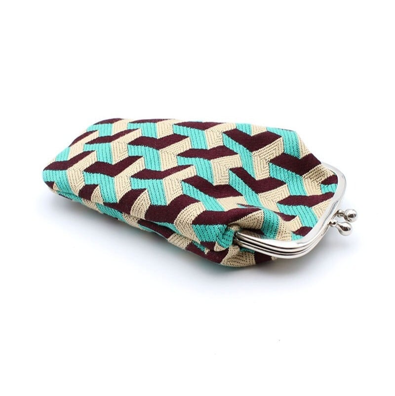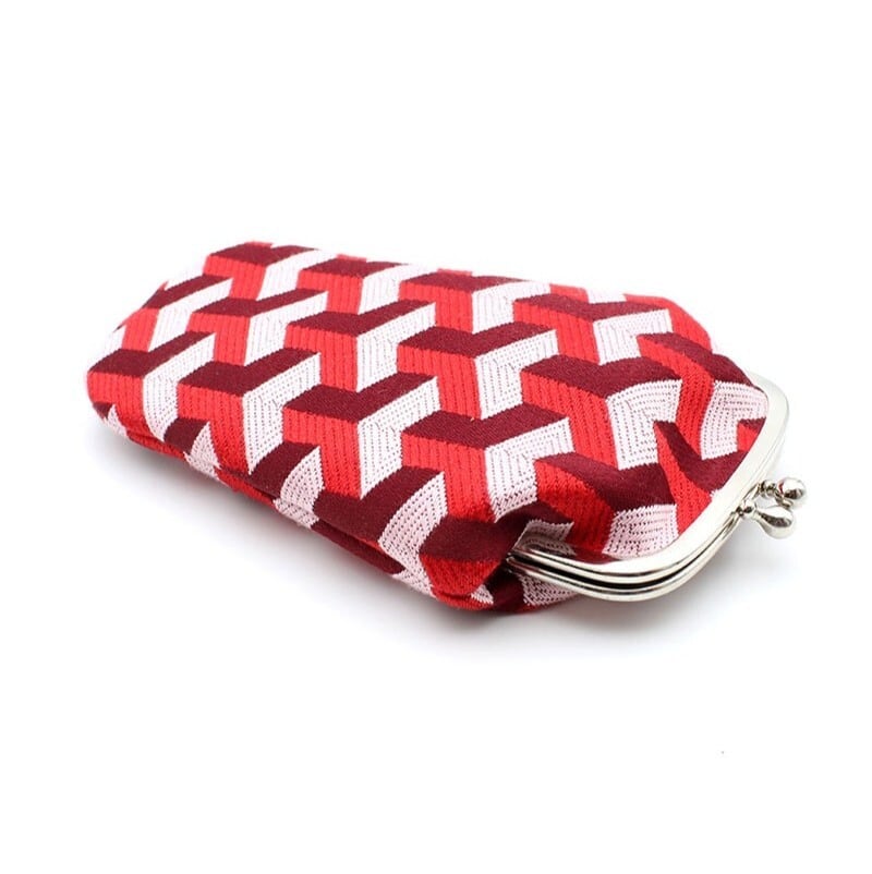 和の伝統を思わせるがま口財布型のフォルムと、幾何学模様のモダンなデザインが融合したメガネケース。